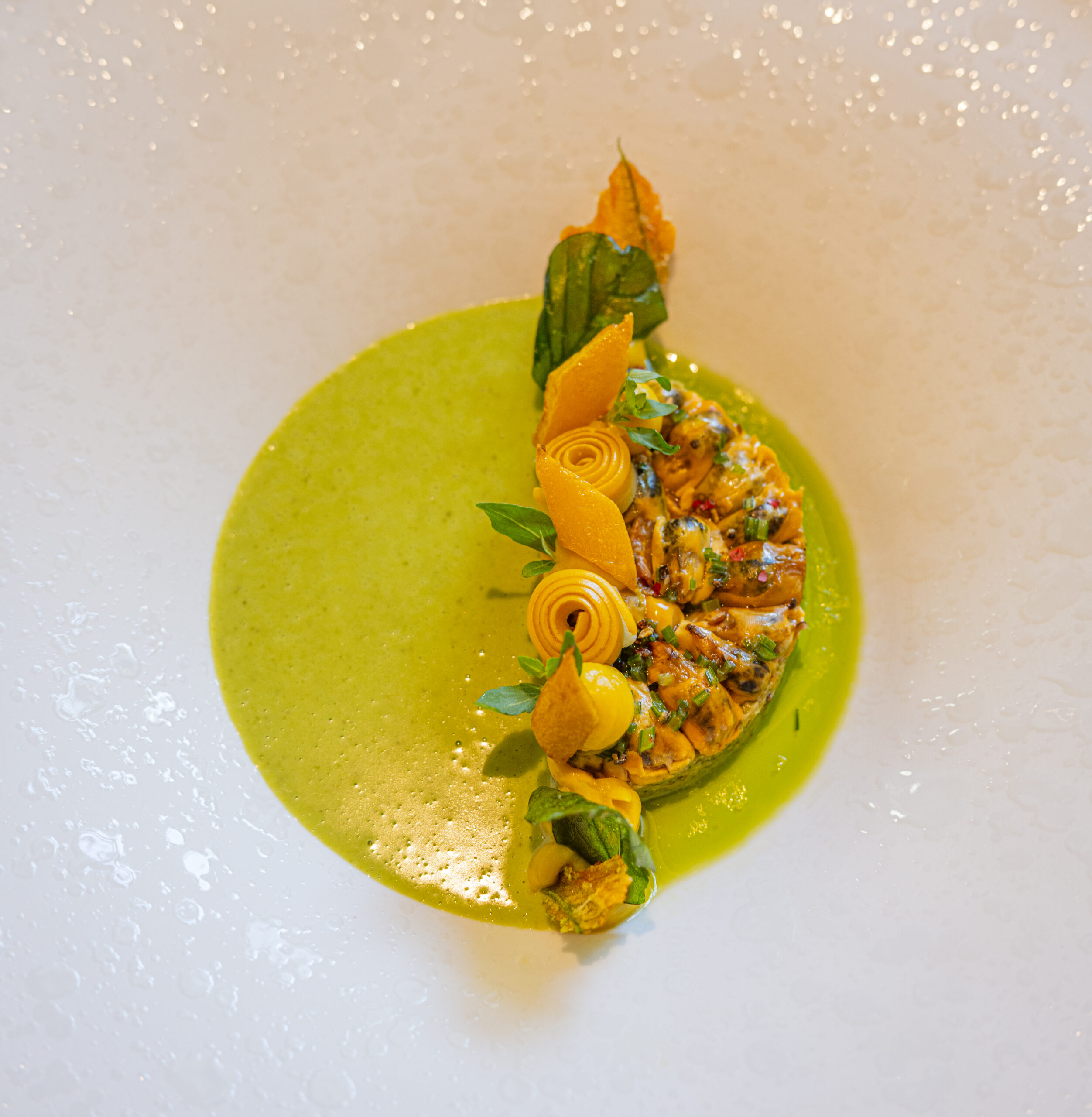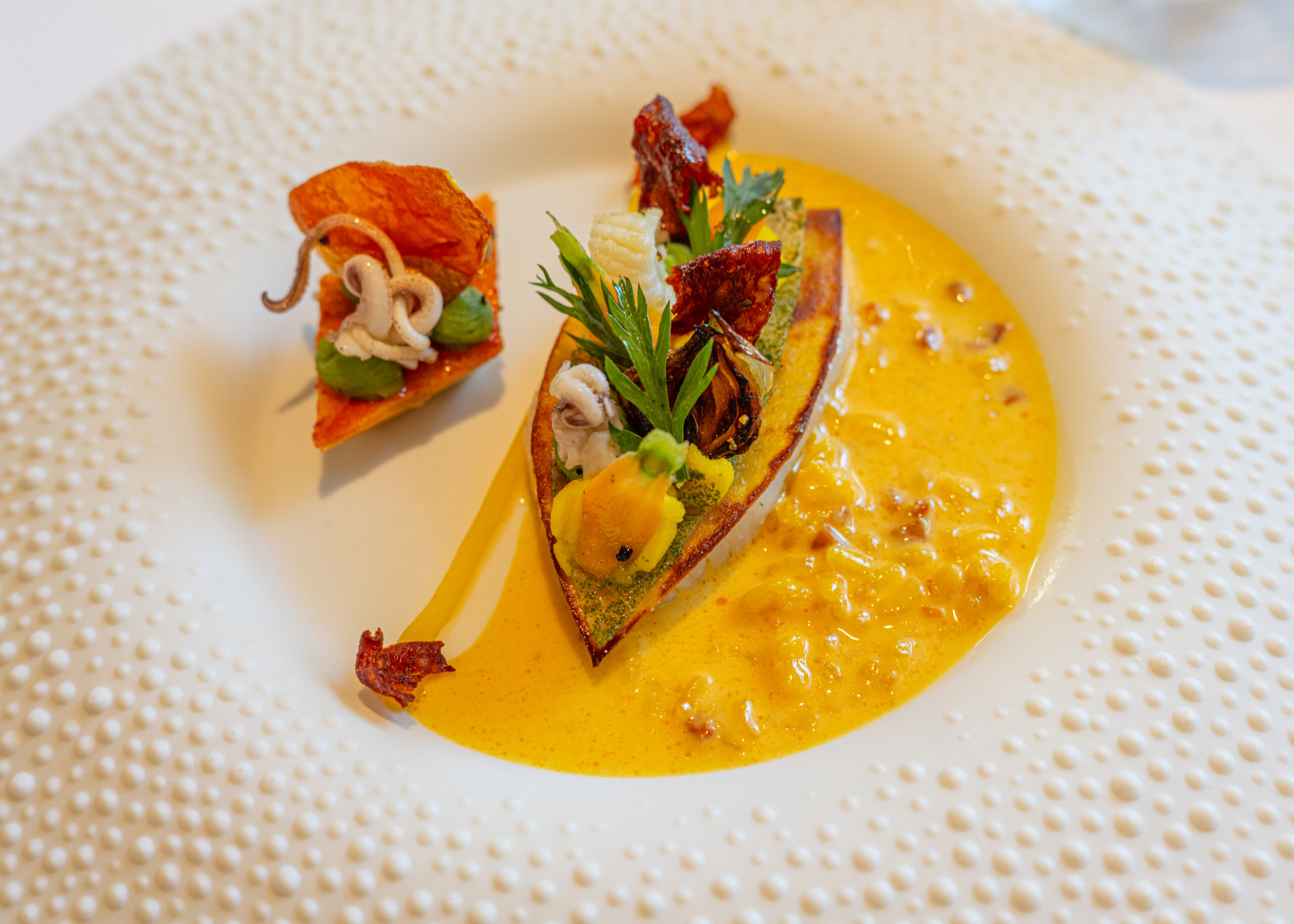 Pain Perdu with Mango Sorbet, Blueberries, Bananas, Maple Syrup